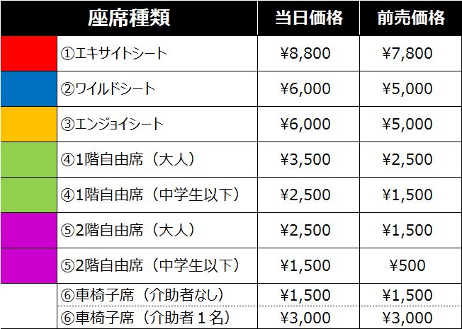 また、ワイルドシート、エンジョイシートは当日券・前売券共に4,900円となります。